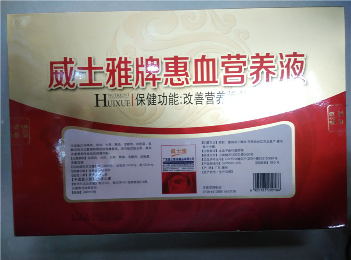 產品名稱威士雅牌惠血營養液受讓方地址申請人中文名稱廣東威士雅保[jian]品有限公司申請人地址潮州市潮安區庵埠威士雅大廈保[jian]功能改善營養性貧血功效成分/標志性成分含量每100ml含:總皂甙 14.0mg、鐵12.0mg主要原料烏雞肉、 當歸、大棗、熟地、龍眼肉、絞股藍、乳酸亞鐵適宜人群營養性貧血者不適宜人群少年兒童食用方法及食用量每日2次,每次30ml;連續食用2-4周,長期食用效果更佳產品規格10ml/瓶、30ml/瓶、120ml/瓶、240ml/瓶保質期18個月貯藏方法密封、置陰涼干燥處;開瓶后未飲完應蓋嚴,置冰箱中冷藏注意事項本品不能代替藥物批準日期2002-09-20批準變更日期變更內容備案日期2014-12-16備案內容批準備案日期:2014-12-16,申報單位地址已由廣東省潮安縣庵埠威士雅大廈變更為潮州市潮安區庵埠威士雅大廈,轉讓方中文名稱轉讓方英文名稱轉讓方地址受讓方轉讓前批準文號批準轉讓日期補發日期備注產品編號14329批準文號衛食健字(2002)第0650號注銷日期注銷原因有效期至產品技術要求根據《關于印發保[jian]食品產品技術要求規范的通知》,2011年2月1日前受理的產品暫無技術要求。注本數據庫提供自2003年12月12日之后經國家食品藥品監督管理總局審批的保[jian]食品的基本信息。如有數據方面問題,請聯系國家中藥品種保護審評委員會(國家食品藥品監督管理總局保[jian]食品審評中心),聯系電話:轉712