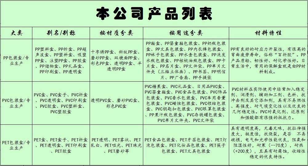 義烏索尼克印刷包裝有限公司主營PP、PVC、PET等各類包裝盒,產品覆蓋PP鞋盒、PP襪子盒、PP奶瓶盒、PP文具盒、PP文件夾/袋、PP卡片盒、PP名片夾、PP碟片夾、PP胸卡夾、PP廣告扇、PP明信片、PP書簽、PVC禮品盒、PVC糖果盒、PVC資料夾/袋、PET包裝盒等等。