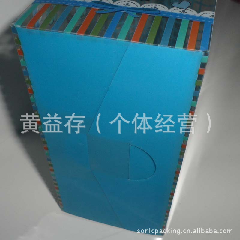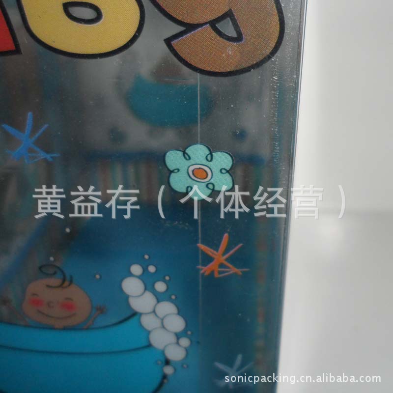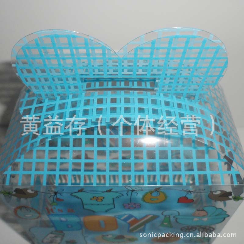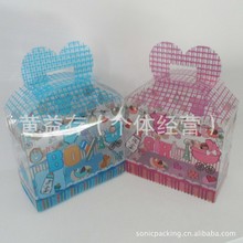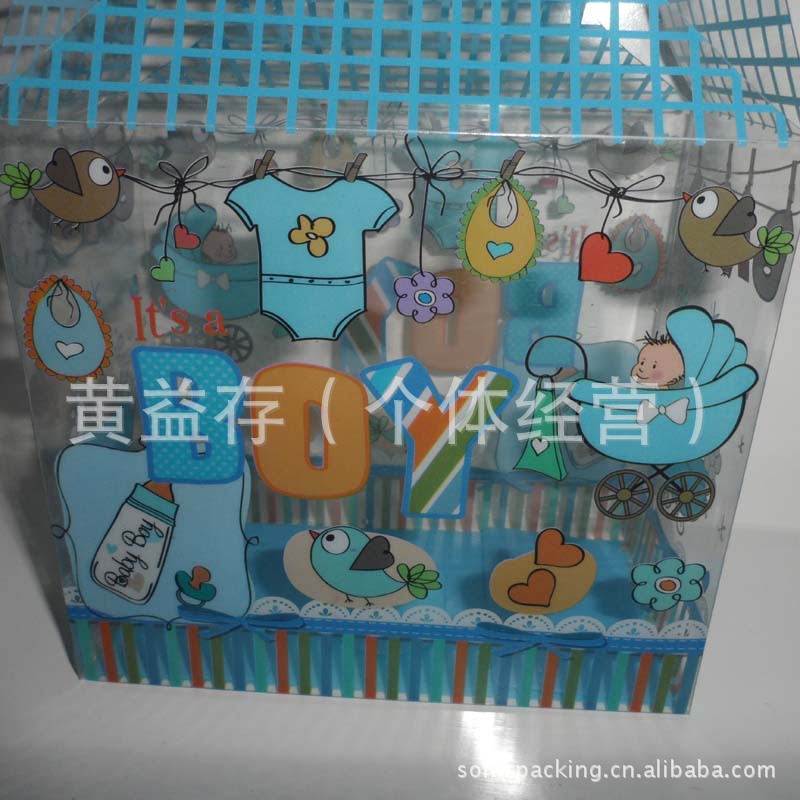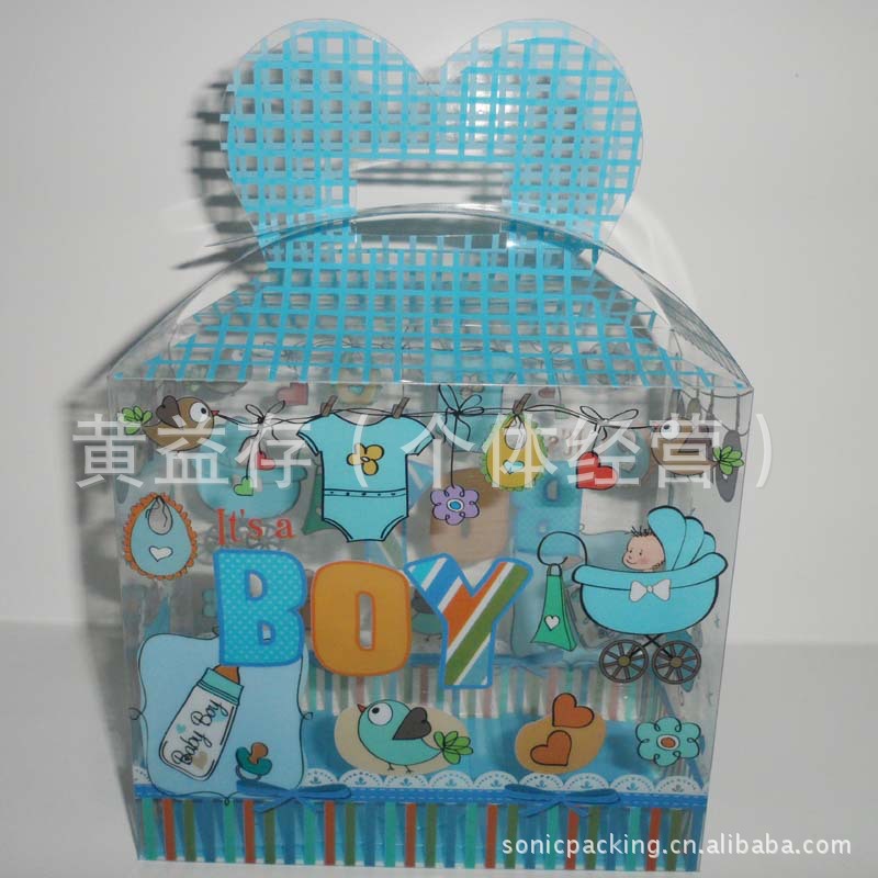 【產品描述】:整個包裝盒可愛童趣,采用優質透明PVC材料,多色印刷;盒子正背面印有各式幼兒兒童用品圖案,底部帶花式盒扣;使用的材料厚度是0.21MM,軟硬度適中;有藍色、紫色可選;整體而言,是一款小巧精致的禮品包裝盒。