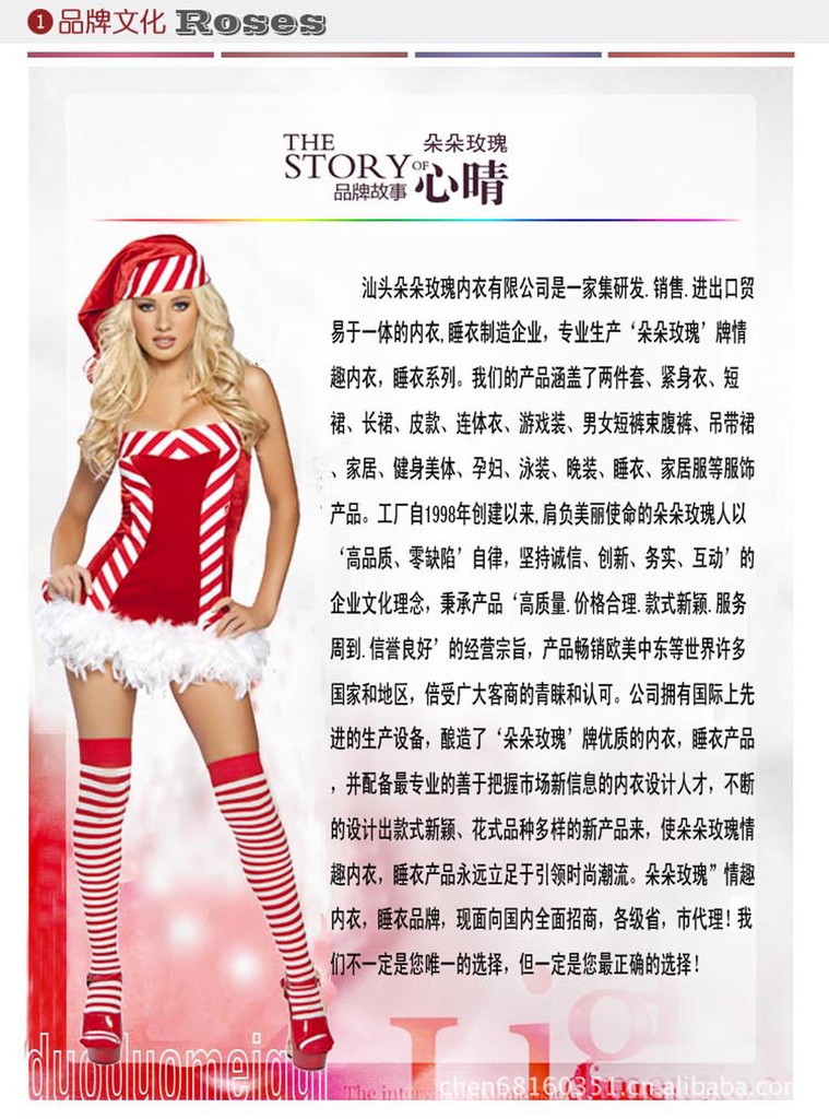 朵朵玫瑰情趣內衣是以歐洲內衣的典雅和東方文化的魅力完美結合作為設計理念,產品美侖美奐,時尚高雅,充滿神秘與性感的設計味道,很多款式的靈感均來自自然與美麗傳說。朵朵玫瑰是欲望,性感、羅曼蒂克、浪漫及性感內衣的代名詞。公司向著品牌化,國際化,系列化的發展方向贏得了廣大國內外消費者的認可和信賴。同時朵朵玫瑰情趣內衣是情人節的饋贈禮物。所以產品暢銷歐,美,日,韓!