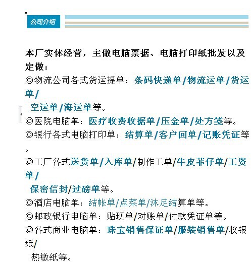 廣州市栩騰辦公用品有限公司自產自銷及代理批發的電腦打印紙、不干膠條碼紙、收銀紙、復印紙、碳帶、辦公用品、辦公設備、勞保用品等、電腦打印紙、不干膠條碼紙、收銀紙、復印紙、碳帶、辦公用品、辦公設備、勞保用品、學習用品暢銷市場,在行業當中享有較高的地位,主要客戶包括倉儲物流、商超零售、工業制造、商務辦公、衛生文教等,公司與多家零售商和代理商建立了長期穩定的合作關系。我們的經營宗旨是:“用服務與真誠來換取你的信任與支持,互惠互利,共創雙贏!” 我公司愿與國內外各界同仁志士竭誠合作,共創未來!