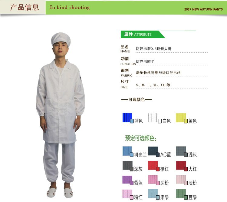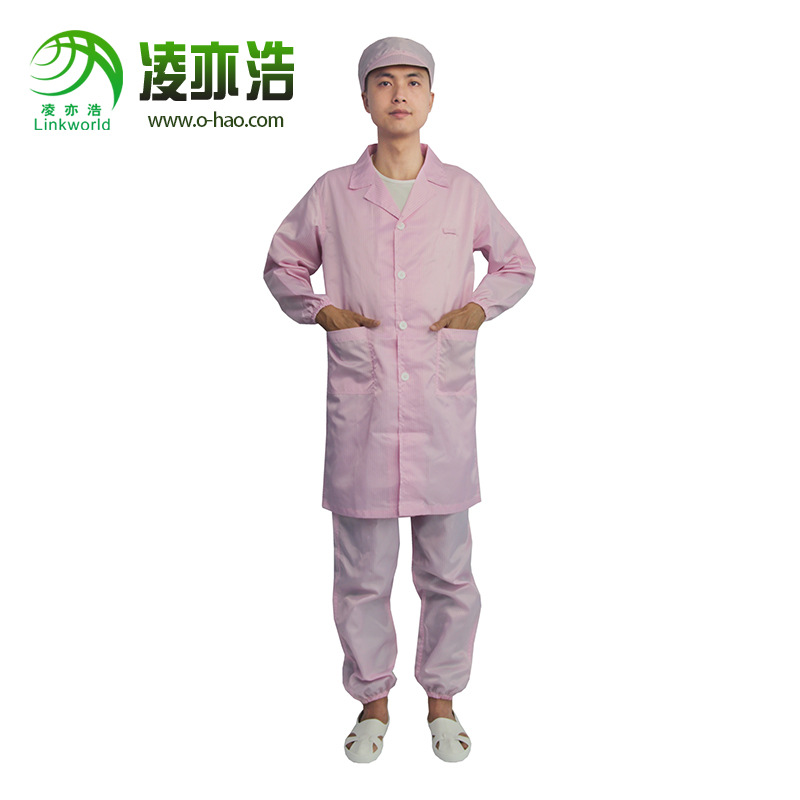 凌亦浩生產的防靜電服大褂用不同色的防靜電布制成。布料紗線含一定比例的導電紗,通過導電纖維的電暈放電和泄漏作用消除服裝上的靜電。由于不銹鋼纖維屬金屬類纖維,所以,凌亦浩選擇由它織成的防靜電布料,使用這種布料生產出的防靜電服大褂導電性能穩定,不隨服裝的洗滌次數而變化。