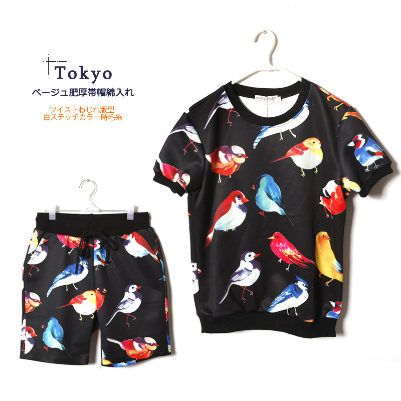2015夏季新款男士太空棉面料小鳥花型男短袖T恤短褲套裝