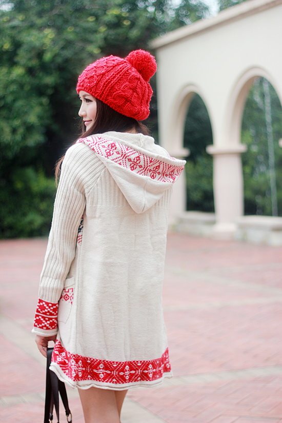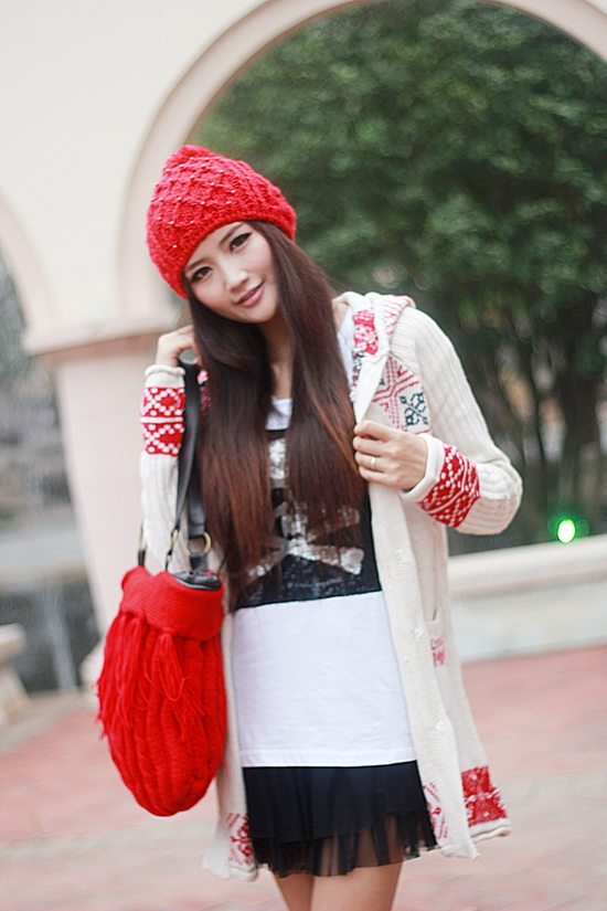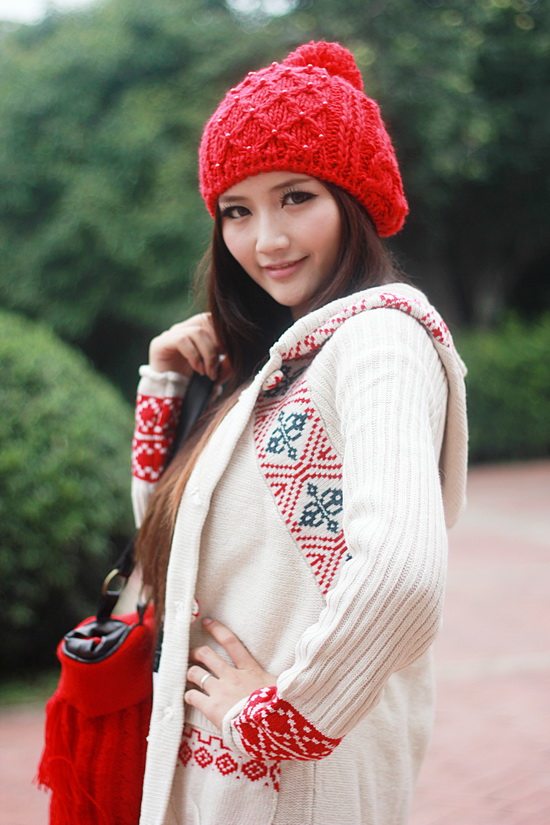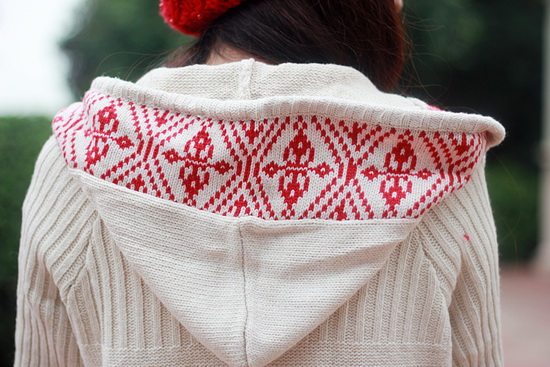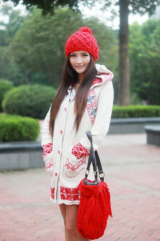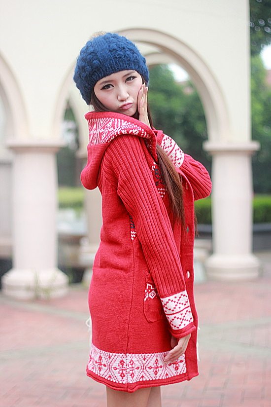 以白色為主色調看起來比較清新,再配以紅色的伊斯蘭風格的花紋,清新中顯出高雅的氣質。后面的小帽帽給人舒適安寧的感覺,俏皮的紐扣仿佛點點繁星點綴在潔白的大地上。整體長版的設計使身材顯的更加的修長簡約中透著可愛。衣袖采用了豎線條的紋路,使得手臂在視覺上有拉長和顯瘦的效果哦。值得一提的是,此款YY袖子還可以當手套使用的。細節圖稍后補上!