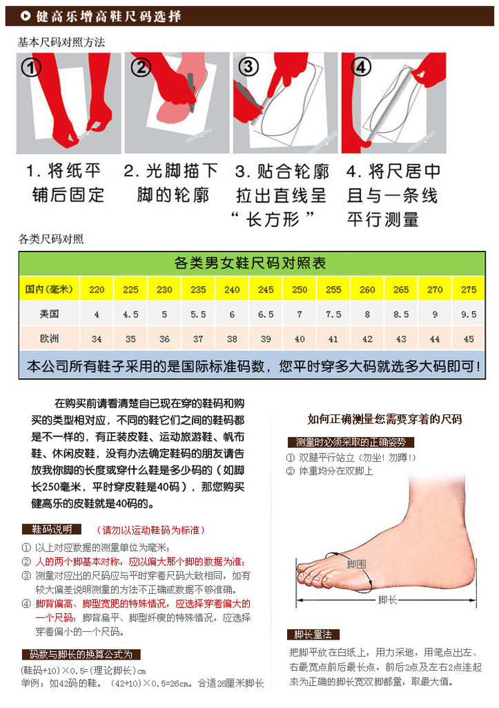 1、本品均采用國標碼,平時穿幾碼現在選擇幾碼就合適,如果不確定自己所穿碼數請參看以下的鞋碼換算。如果收到的鞋子尺碼是您定購的尺碼,但是不合腳,在保證鞋子完好無損的前提下(尚未穿著行走,無其損傷、劃痕等不影響我廠第二次銷售情況下),我們可以為您更換尺碼一次(在本店有您所需尺碼的情況下),來回的運費由買家承擔。所以在收到鞋子之后請先用干凈的布條或白紙墊好再試穿,以免鞋底出現劃痕或有泥垢。