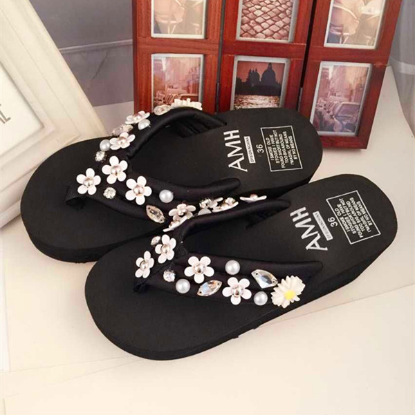 2015年夏天沙灘坡跟拖鞋 韓版波西米亞小雛菊花朵鑲鉆珍珠