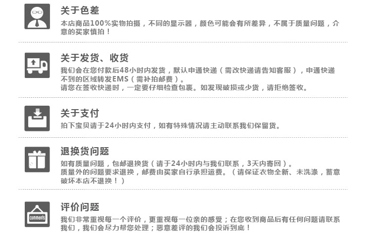 3、免責申明:不因少許線頭,可以去除的污點,細微色差,以及沒有想象中漂亮,大,小,等主觀理由要求退換。