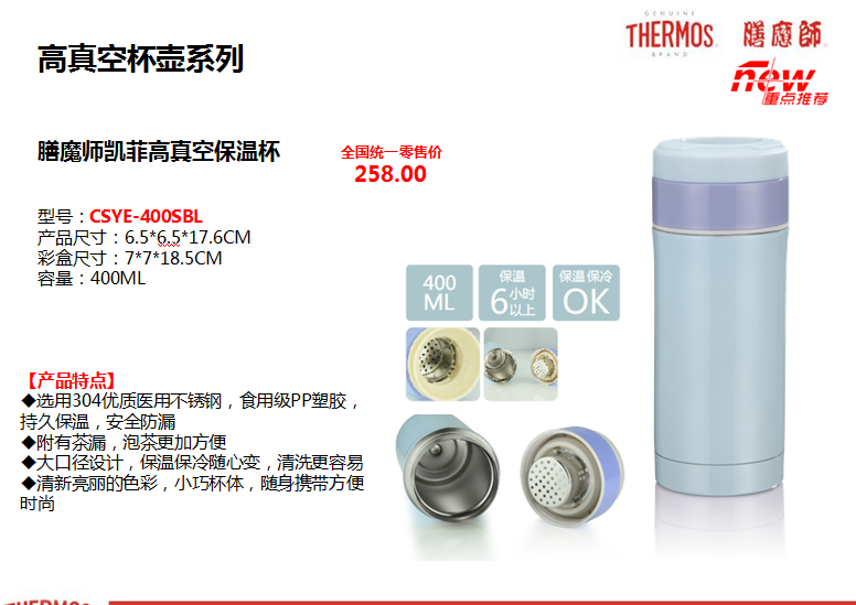 膳魔師杯壺是我們日常所見的一種高檔杯壺,它的中國工廠就在我們江蘇省昆山市,膳魔師就像我們在鋼筆中的派克一樣,擁有著很高的知名度,隨著時代的進步和發展,這些高端品牌的東西也會越來越多的出現在我們老百姓的生活視野中!膳魔師保溫杯是設計比較人性化,為廣大消費者提供了很多的便捷攜帶?,F在杯身也可以定制廣告,為更多的企業選擇高端禮品提供了一個很好的方案,所以也越來越暢銷!本公司有大量膳魔師杯對外出售,可加工定制印logo,歡迎大家前來公司選購定制! 膳魔師保溫杯系享譽國際已百年之全球知名高真空系列產品品牌THERMOS(膳魔師)家族的一員。膳魔師致力研發的高科技真空技術,將雙層優質不銹鋼內部抽真空處理,容器內的真空隔熱層,能有效的達到保溫效果,膳魔師保溫杯保證能夠給您很好的保溫效果,讓您的食物、飲品保溫時效更長久,更新鮮! 太空杯系類人性化拎帶或拉環設計,便于攜帶,適合家庭休閑,戶外旅行,抗震防摔、不易破碎、經久耐用