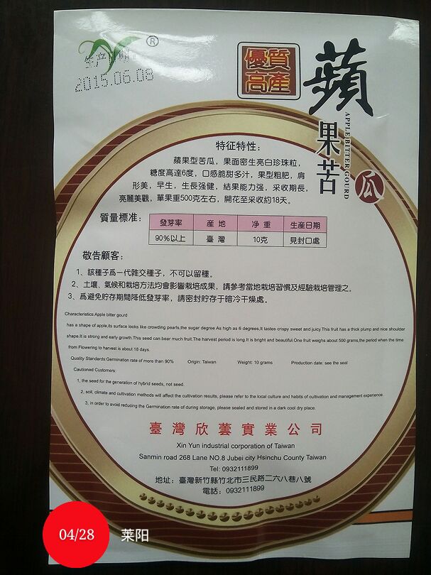 一代交配品種臺灣蘋果苦瓜種子,蘋果型苦瓜,果面密生亮白珍珠粒,糖度高達6度,口感脆甜多汁,果型粗肥,肩形美,早生,生長強健,結果能力強,采收期長,亮麗美觀,單果重500克左右,開花至采收約18天。較抗**病和霜霉病,葉綠色,莖稈粗壯,長勢強健,結瓜率高;瓜苦味稍淡、爽脆可口,鮮食、炒食均可。露地栽培產量667平方米高可達3500kg,大棚栽培產量可達4000kg以上。生長期210~240天,結果期180~210天。 水果苦瓜跟其他的苦瓜 比,它的苦味不那么濃,苦味要淡一點水果苦瓜味道清淡,更適合生食苦瓜個大,而且每個節間都有瓜,這是它與普通苦瓜的不同之處,此外,它生長勢旺,坐果能力強,產量穩定,抗病性好。 蘋果苦瓜營養豐富,所含蛋白質、脂肪、碳水化合物等在瓜類蔬菜中較高,特別是維生素C含量,每百克高達84毫克,約為冬瓜的5倍,黃瓜的14倍,南瓜的21倍,居瓜類之冠。
