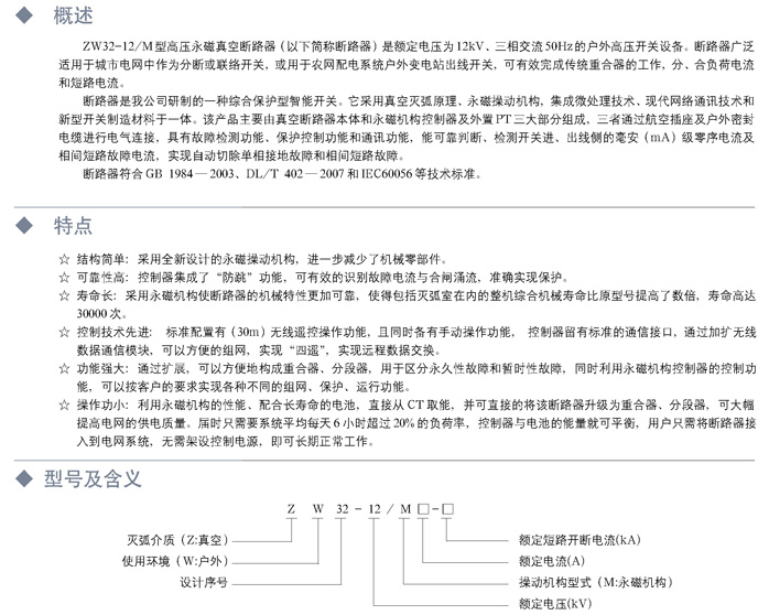 ..............................................................................................................................................ZW32-12M隨著計算機技術、傳感器技術和網絡通信技術的發展以及電力系統中配網運行要求的提高,功能單一的一次設備在配電網絡的應用中日益顯示出其不便之處,因而從配電網系統的全局著眼,開發基于節點(終端)的高壓永磁真空斷路器已勢在必行?;谶@一思想,樂清市寶高電器有限公司開發研制了ZW32-12型高壓永磁真空斷路器,它集微處理機技術、現代網絡通訊技術和新型開關制造技術于一體,廣泛適用于城市電網作為分斷或聯絡開關,或用于農網配電系統戶外變電站作為出線開關,可有效完成傳統的重合器的工作,分、合負荷電流和短路電流。裝置內部所配置的測量保護控制和通訊功能可充分滿足配電自動化系統要求。