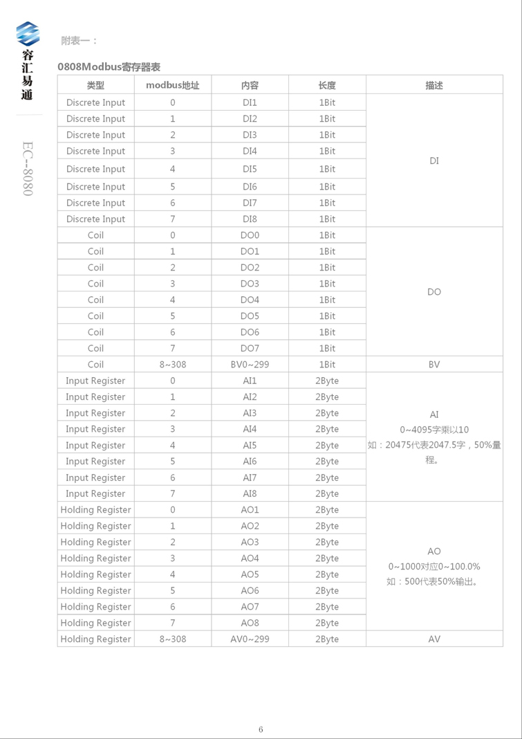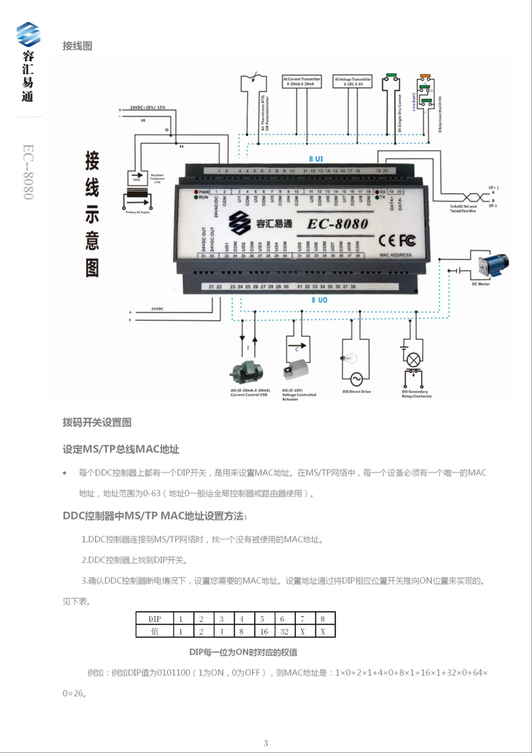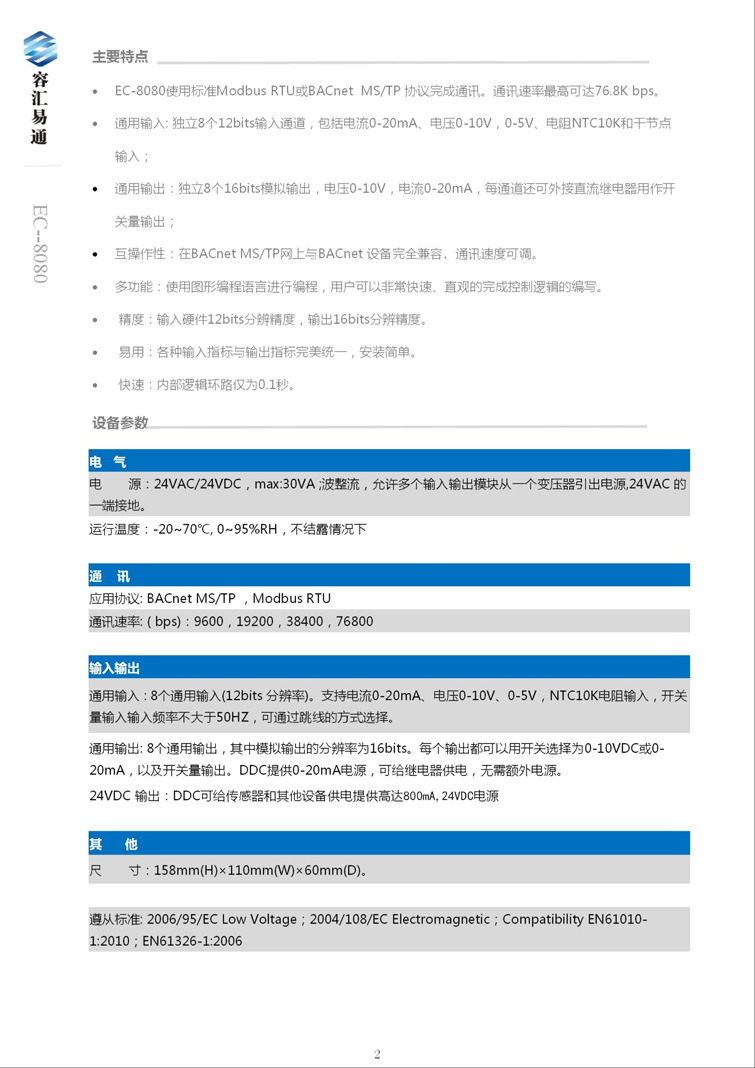 · EC-8080使用標準Modbus RTU或BACnet MS/TP 協議完成通訊。通訊速率可達76.8K bps。