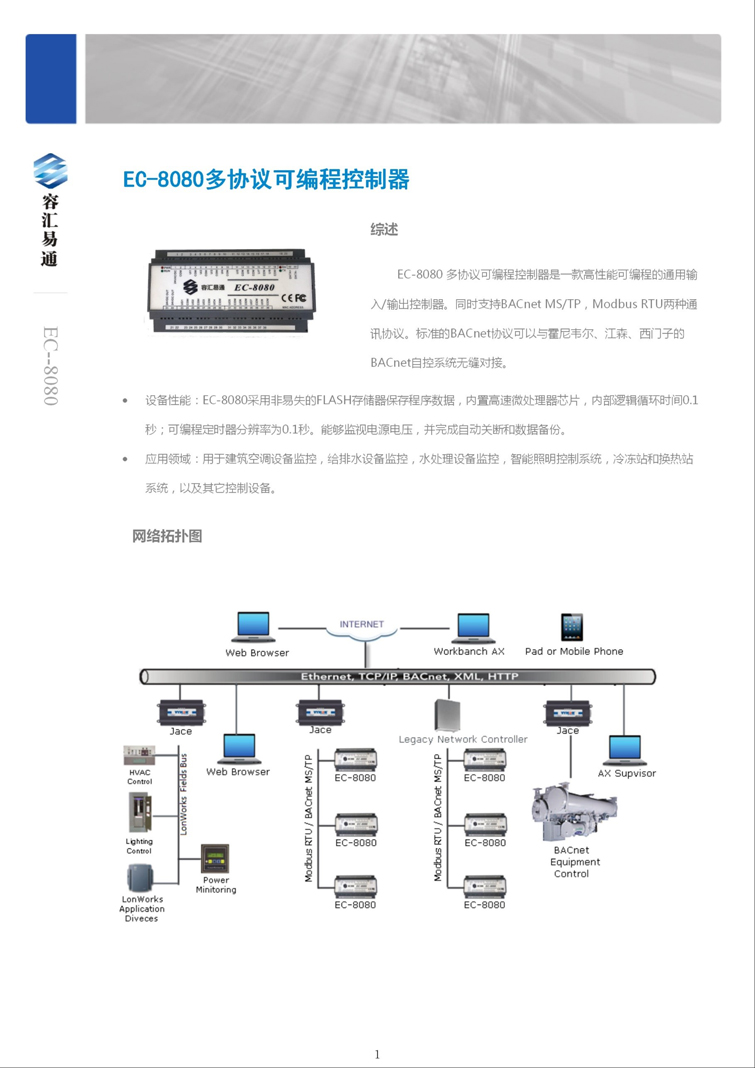 EC-8080 多協議可編程控制器是一款高性能可編程的通用輸入/輸出控制器。同時支持BACnet MS/TP,Modbus RTU兩種通訊協議。標準的BACnet協議可以與霍尼韋爾、江森、西門子的BACnet自控系統無縫對接。