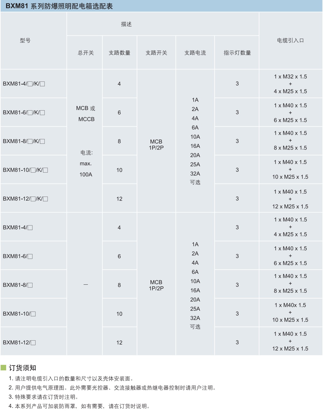 BXM(D)81防爆照明動力配電箱選配表