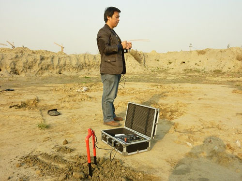 6.區域測試時,把發she器放在地面上,把發射天線連接到發she器的對應的插孔內。在發she器打開的時候。絕dui不要插拔發射天線,如果那樣做的話,將會對機器造成損壞,對操作人員造成嚴重傷害。在發she器的前面,挖一個小的壕溝,把發射天線埋到溝里,埋到黑線處。把頻率選擇設置到需要的位置。打開發she器,然后逆時針旋轉“水平”和“垂直”兩個旋鈕到最da處,然后再順時針旋轉著兩個兩個按鈕,直到它們上面對應的兩個指示燈變亮(這個用來設置發she器適合地面情況)。在3到5分鐘之后,站到離發she器5到6米遠處,像上面練習使用接收天線的時候一樣,圍繞這個發射天線做圓周運動,保持距發射天線的距離5到6米遠,如果這個區域沒有要找的目標物,接受天線不應當交叉。