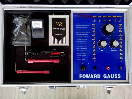 一個鑲有鋁邊并帶有把手和兩把鎖的白色箱子,該箱子里裝有發she器和其它 附件。該發she器是安裝在盒子里,發she器的面板上有六個LED頻率指示燈,且每個指示燈都代表某項功能,字母C開頭的表示銅,字母S開頭的表示銀,字母G開 頭的表示金,字母L開頭的表示鉛,字母T開頭的表示錫,字母D開頭的表示寶石。在指示燈的下面有個頻率選擇開關,可以自由調節您所需要探測的金屬種類。頻 率選擇開關的下面,有兩個旋鈕,分別標有"水平"、"垂直"字樣,分別代表探測深度與范圍。左右各有一豎排十個指示燈,可以用水平或者垂直鈕來調節您所要 選擇的探測深度和探測范圍(探測深度為10-100M,每10M一個指示燈共計十個,探測范圍為200-2000M,每200M一個指示燈共計十個)。主 機面板最下方一排從左起為電源總開關,電源充電孔,以及一紅一黑的兩個發射天線插孔。充電電路已經被設計在儀器內部,電池安裝在儀器中部的面板下面。(切 記:充電時請先用大陸公司贈送的220V轉110V的轉換器插入家用電插座然后將充電器接插在轉換器上)